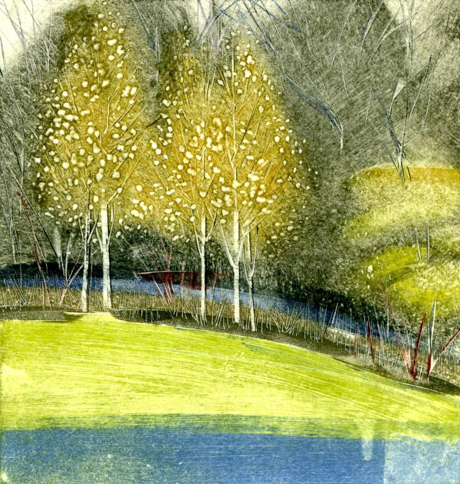 This workshop will suit those of you who are interested in learning a more painterly and experimental approach to printmaking, ranging from landscape inspired images, as shown here, to drawings as in my Beauty and the Beast monotype (see RA Summer Exhibition in news). Students will learn techniques for mark-making on a plate using water soluble printing inks and a variety of materials, textured papers and fabric for example, and tools which may include rollers, brushes and 'drawing' tools etc., and finally how to take a print from their artwork.